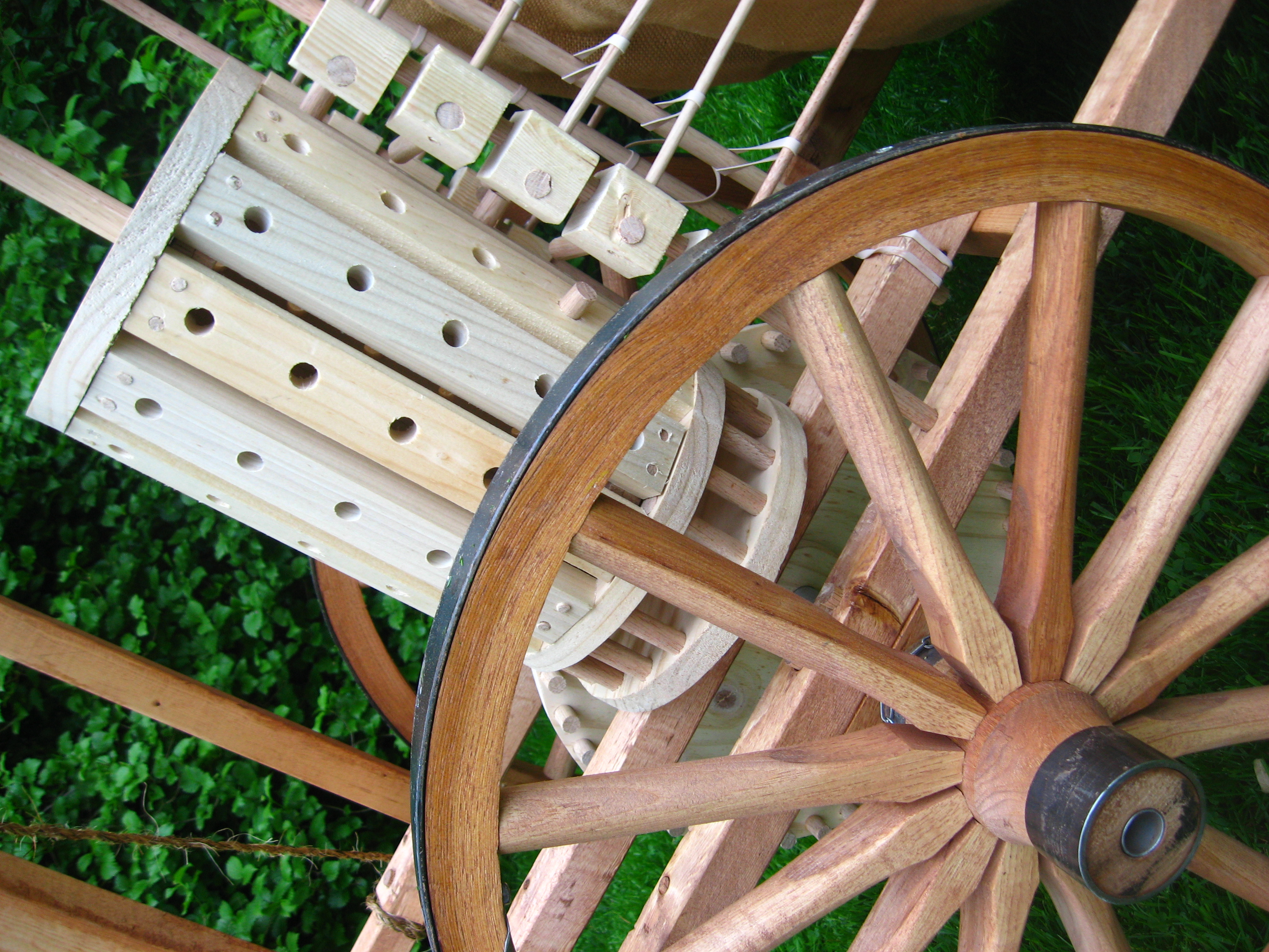 24" cart wheels were sourced from the excellent online wagon wheel shop CustomWagonWheels.com. Special thanks to my dad for helping me through planning and measurements, letting me use his workshop, and drilling many of the hundreds of drill-pressed holes we needed for the drum.